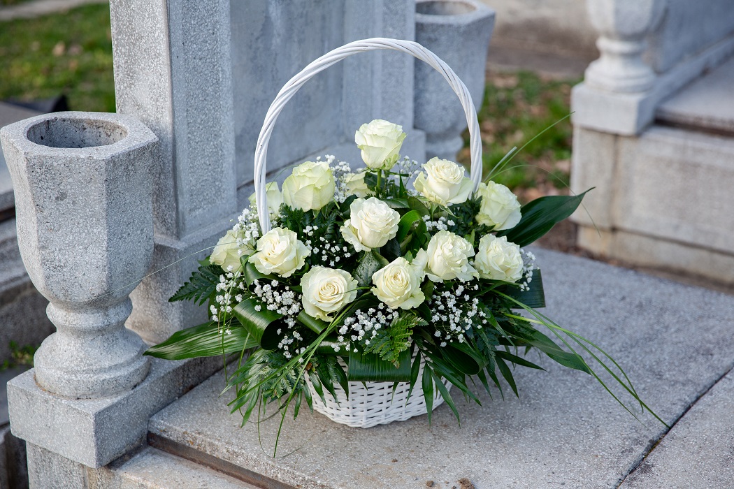 Coș funerar cu flori delicate, potrivit pentru eveniment de înmormântare.