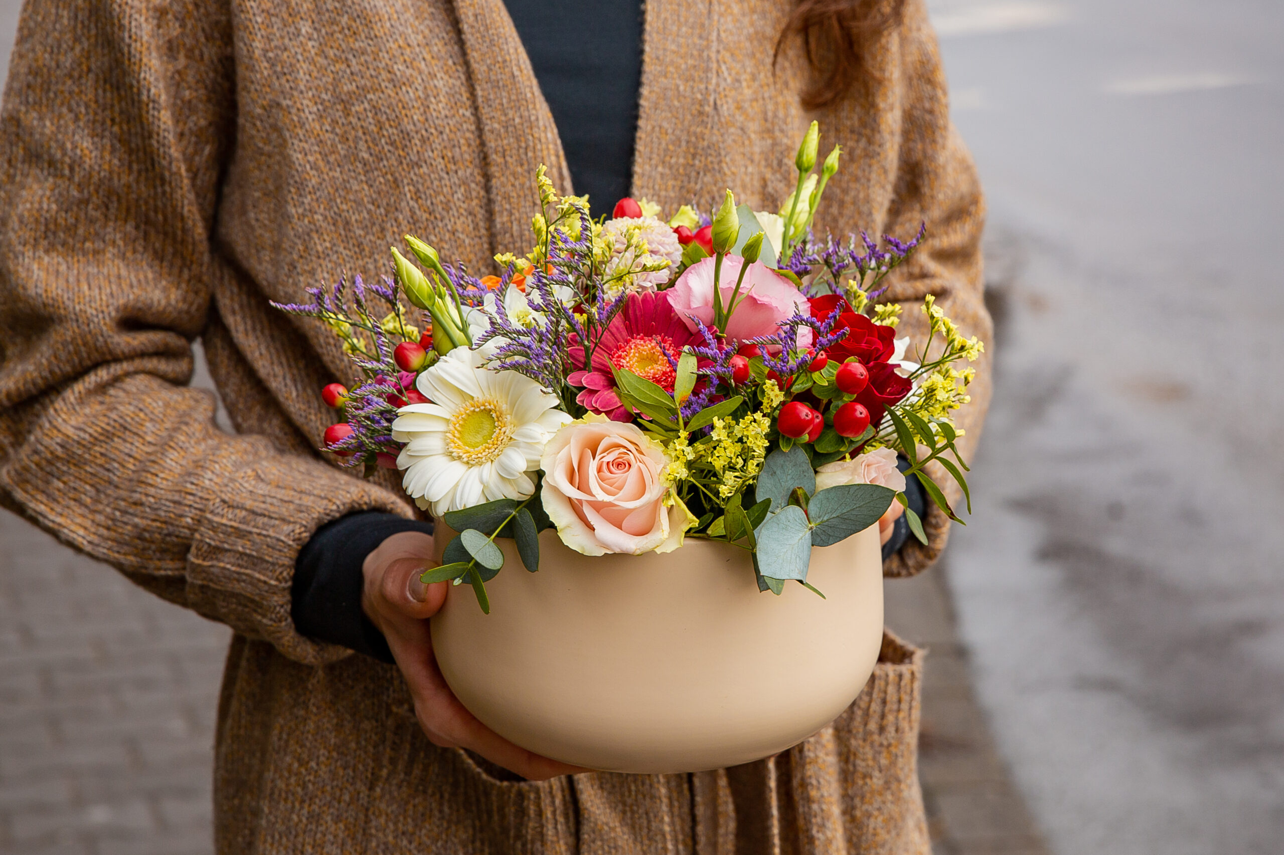 Aranjament vesel în ceramică cu flori colorate.