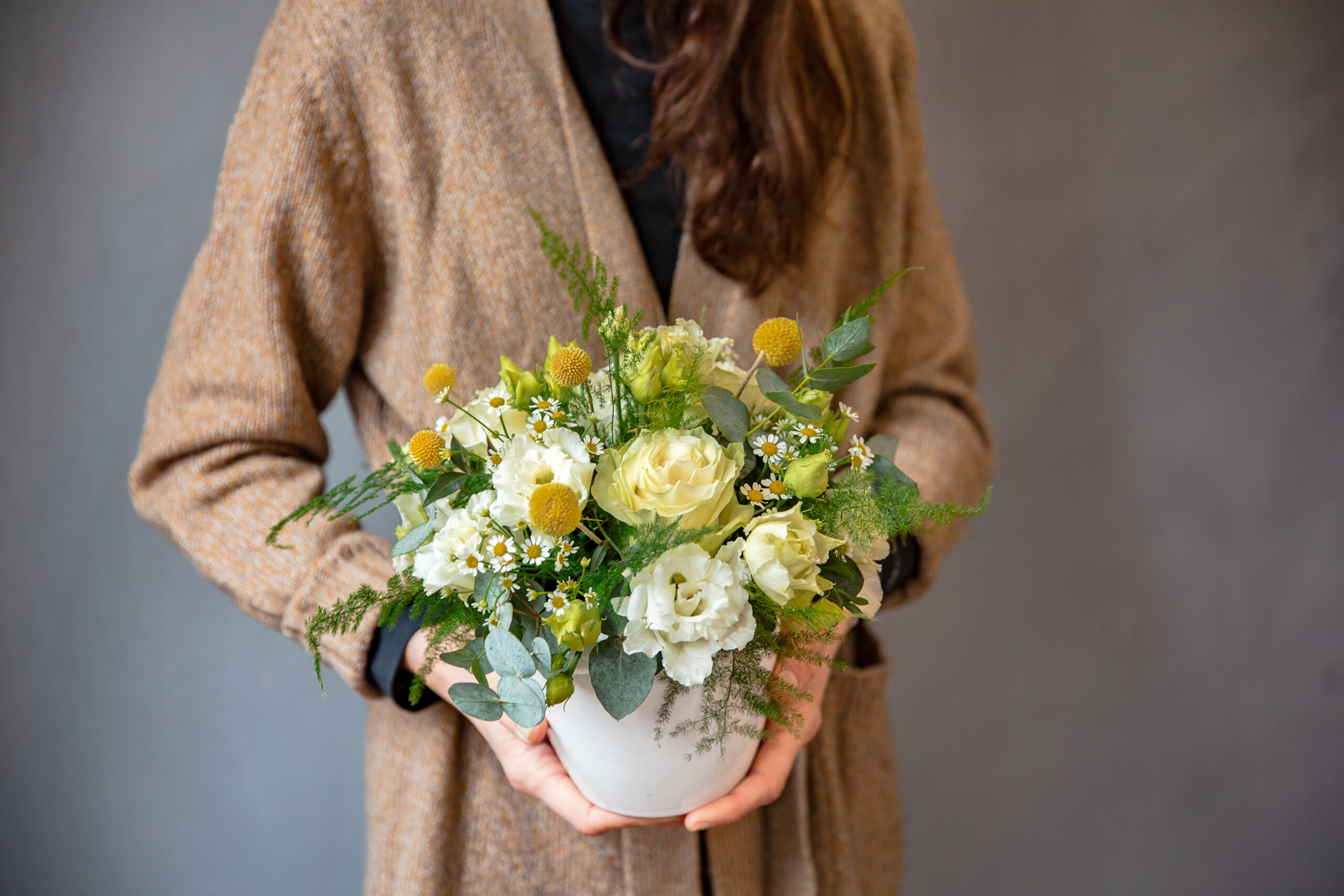 Trimite căldura unei zile însorite prin acest aranjament în vas de ceramică cu flori în nuanțe de alb-galben.